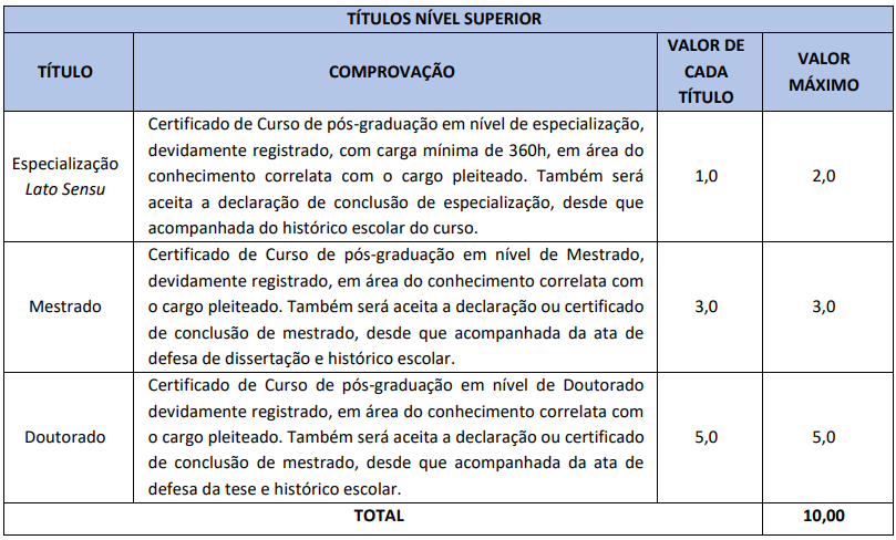 A prova de títulos será realizada considerando os títulos de formação acadêmica. A pontuação para a prova de títulos será realizada da seguinte forma: