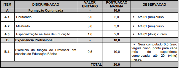 A prova de títulos será realizada considerando os títulos de formação acadêmica. A pontuação para a prova de títulos será realizada da seguinte forma: