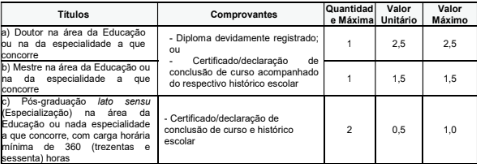 A prova de títulos será realizada considerando os títulos de formação acadêmica. A pontuação para a prova de títulos será realizada da seguinte forma: