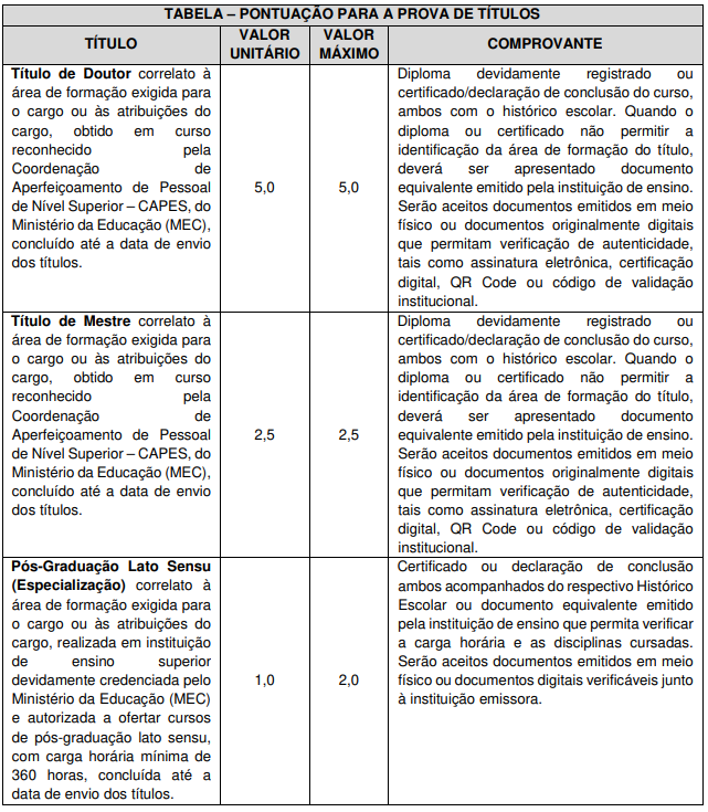 A prova de títulos será realizada considerando os títulos de formação acadêmica. A pontuação para a prova de títulos será realizada da seguinte forma: