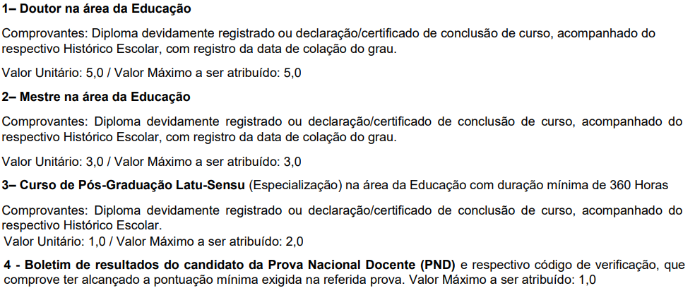 A prova de títulos será realizada considerando os títulos de formação acadêmica. A pontuação para a prova de títulos será realizada da seguinte forma: