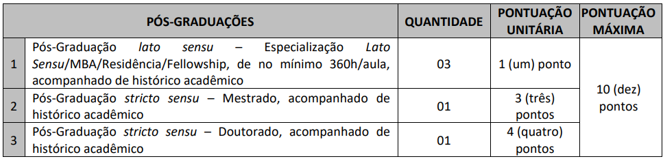 A prova de títulos será realizada considerando os títulos de formação acadêmica. Os títulos deverão ser entregues entre os dias 25 a 27 de novembro. A pontuação para a prova de títulos será realizada da seguinte forma: