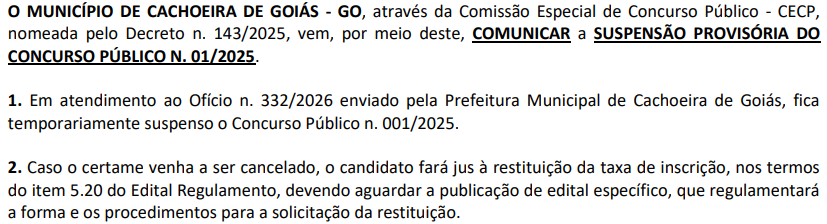 Concurso Cachoeira de Goiás GO: Edital suspenso temporariamente, entenda!