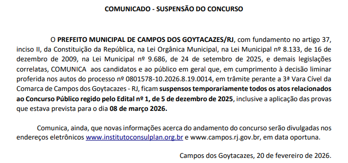 Concurso Campos dos Goytacazes RJ: edital suspenso temporariamente!