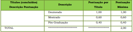 A prova de títulos será realizada considerando os títulos de formação acadêmica. A pontuação para a prova de títulos será realizada da seguinte forma: