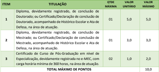 A prova de títulos será realizada considerando os títulos de formação acadêmica. A pontuação para a prova de títulos será realizada da seguinte forma: