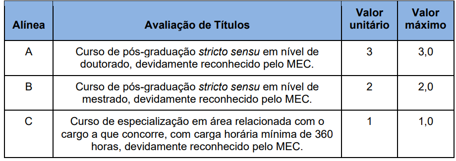 A prova de títulos será realizada considerando os títulos de formação acadêmica. A pontuação para a prova de títulos será realizada da seguinte forma:
