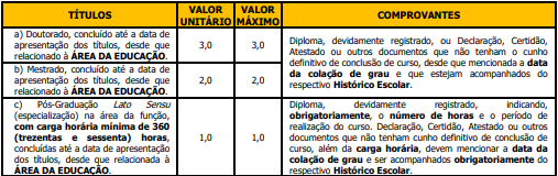 A prova de títulos será realizada considerando os títulos de formação acadêmica. A pontuação para a prova de títulos será realizada da seguinte forma: