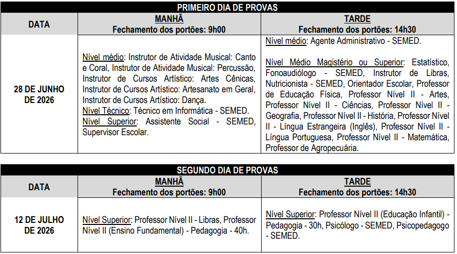 As provas do concurso serão aplicadas na cidade de Ji-Paraná, Estado de Rondônia. A aplicação das provas está prevista para ocorrer em 28 de junho e 12 de julho de 2026. Confira o dia de cada cargo: