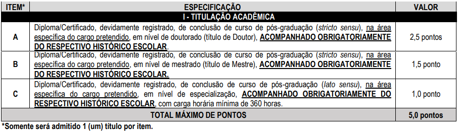 A prova de títulos será realizada considerando os títulos de formação acadêmica. A pontuação para a prova de títulos será realizada da seguinte forma: