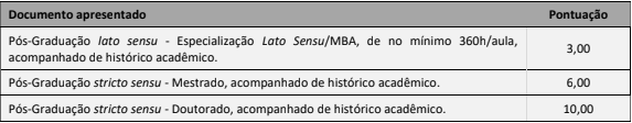 A prova de títulos será realizada considerando os títulos de formação acadêmica. A pontuação para a prova de títulos será realizada da seguinte forma:
