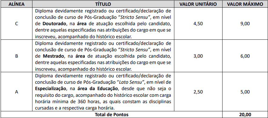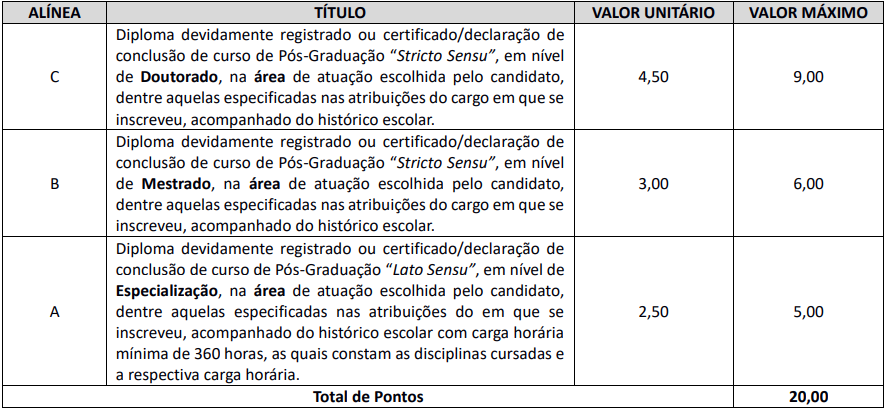 A pontuação para a prova de títulos será realizada da seguinte forma para os cargos de Orientador Educacional, Professor de Arte, Professor de Educação Física, Professor de Educação Infantil, Professor de Ensino Fundamental e Professor de Letras/Inglês:
