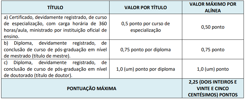 A prova de títulos será realizada considerando os títulos de formação acadêmica. A pontuação para a prova de títulos será realizada da seguinte forma: