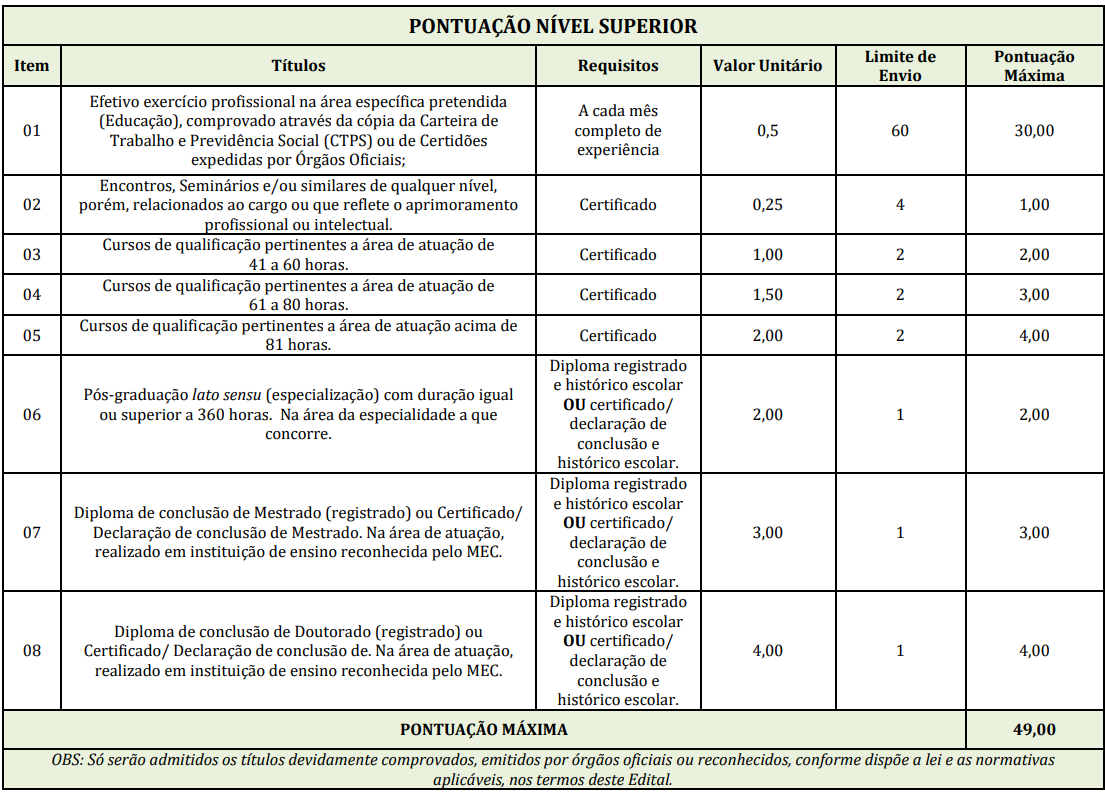 Para a prova de títulos a pontuação máxima será de 49,00 pontos. A pontuação para a prova de títulos foi realizada da seguinte forma: