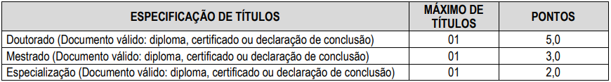 A prova de títulos será realizada considerando os títulos de formação acadêmica. A pontuação para a prova de títulos será realizada da seguinte forma: