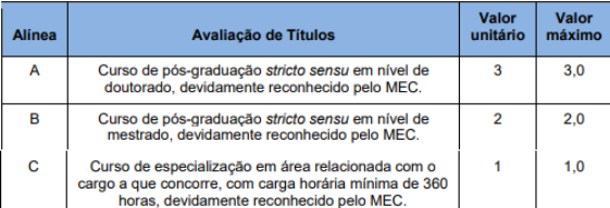 A prova de títulos será realizada considerando os títulos de formação acadêmica. A pontuação para a prova de títulos será realizada da seguinte forma: