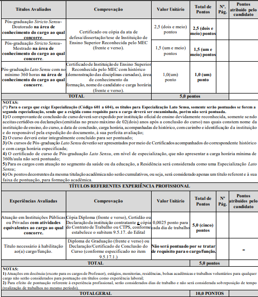 A prova de títulos será realizada considerando os títulos de formação acadêmica. A pontuação para a prova de títulos será realizada da seguinte forma: