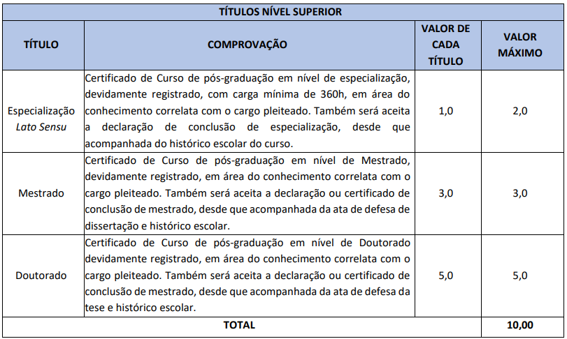 A prova de títulos será realizada considerando os títulos de formação acadêmica. A pontuação para a prova de títulos será realizada da seguinte forma: