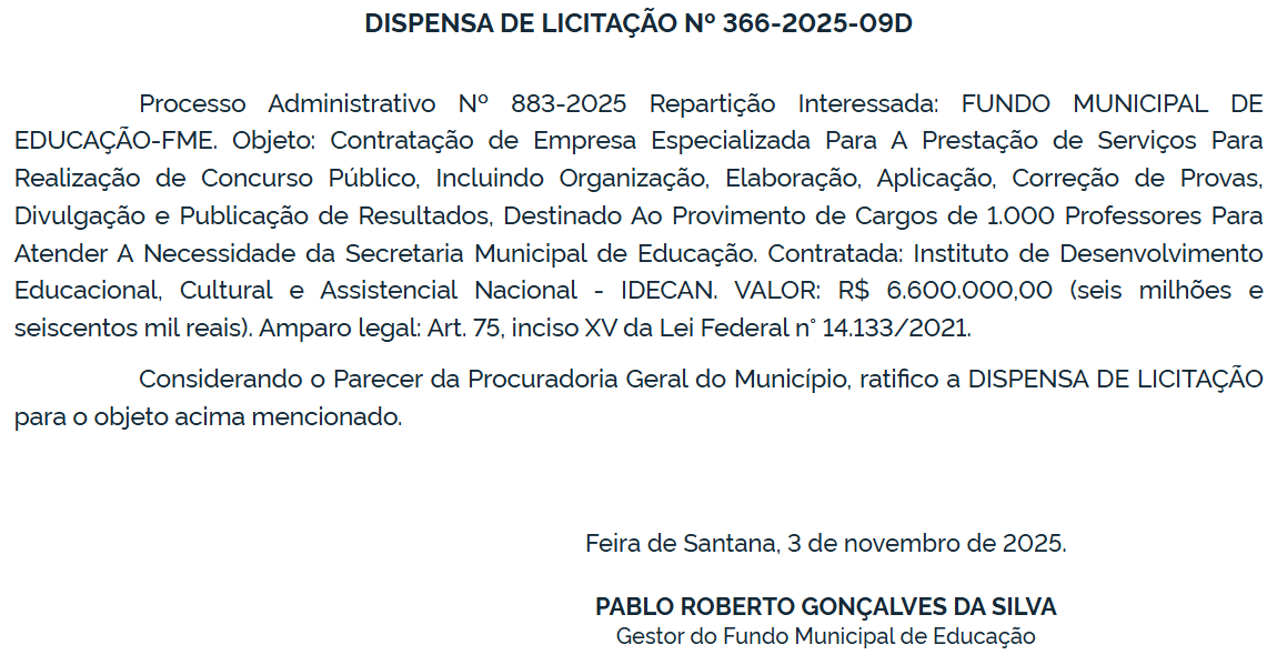 Novo Concurso SME Feira de Santana BA está a caminho! O governo de Feira de Santana, município do Estado da Bahia, por meio do Diário Oficial da União oficializou a banca do novo concurso da Secretaria Municipal de Educação (SME), que ofertará 1.000 vagas. Segundo a Dispensa de Licitação N.º 366, publicada nesta quarta-feira (12), o Instituto de Desenvolvimento Educacional, Cultural e Assistencial Nacional (IDECAN) será a banca organizadora do certame.