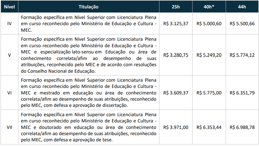 A remuneração para todos os cargos citados será feita conforme a tabela a seguir: